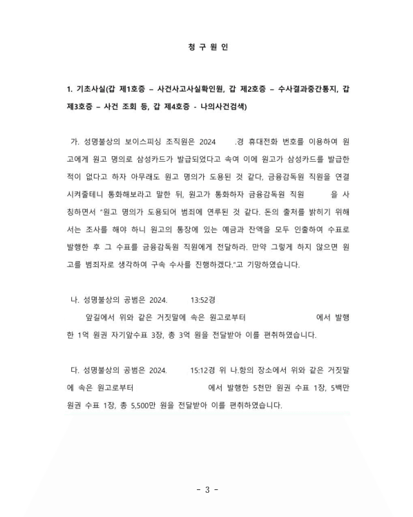 의뢰인은 보이스피싱을 당하여 거액을 수표로 발행하여 전달책에게 전달하였고 이후 보이스피싱임을 인지하고 경찰에 신고하였고 공범들 중 일부가 검거되자 저에게 찾아오셨습니다.