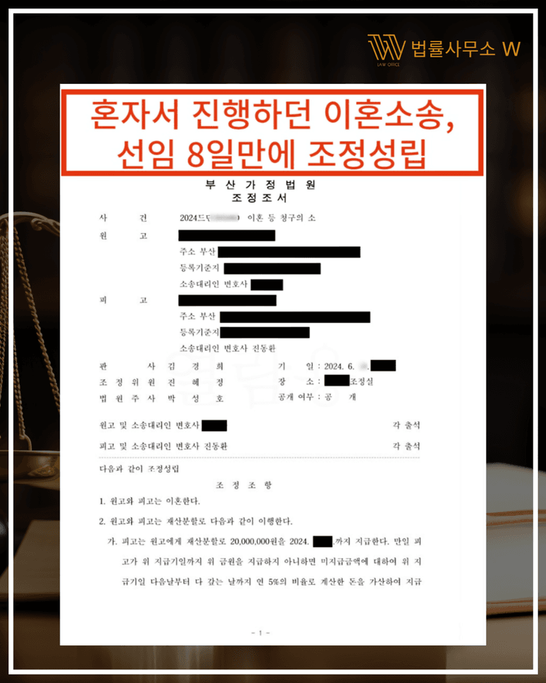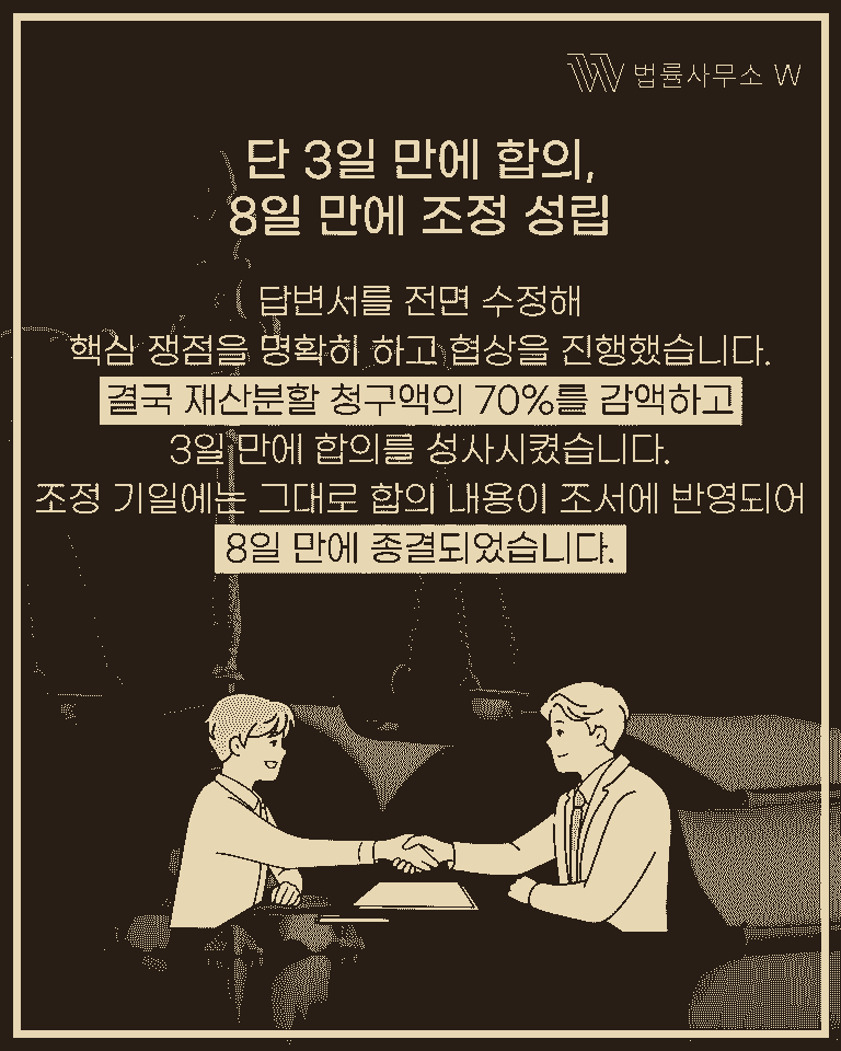 단 3일 만에 합의를 이끌고, 8일 만에 조정이혼을 성립한 사례를 소개합니다.