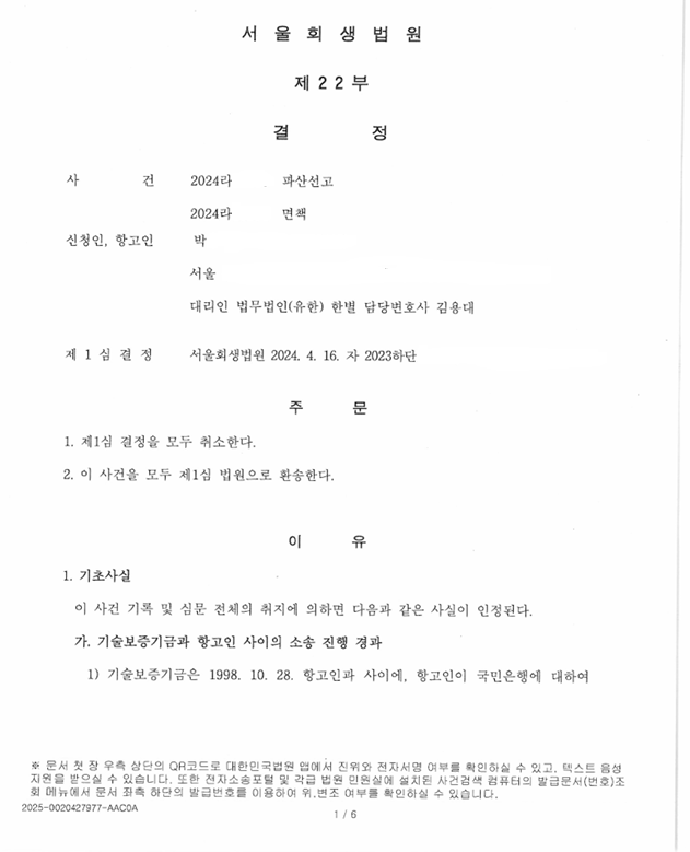 그 후 기술보증기금은 2023년경 재차 소멸시효 연장을 위하여 X를 상대로 구상금 청구소송을 제기하였고, X는 그제서야 위 구상금 채무를 채권자 목록에 포함시키지 않았다는 사실을 깨닫고 위 소송에서 포괄적 면책을 주장하였으나, 법원은 X가 고의로 채권자 목록에 누락하였다고 보아 기술보증기금에 대한 승소판결을 선고하였습니다.