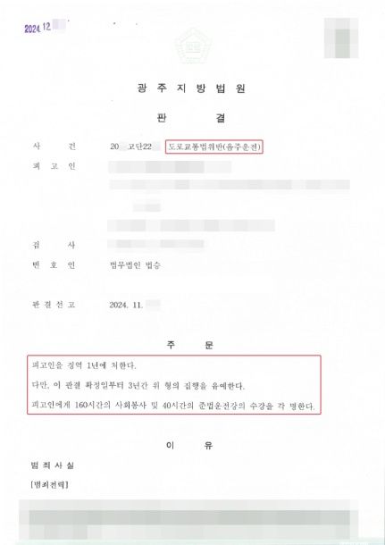 집행유예 (징역 1년, 집행유예 3년, 사회봉사 및 준법운전강의 수강 명령)