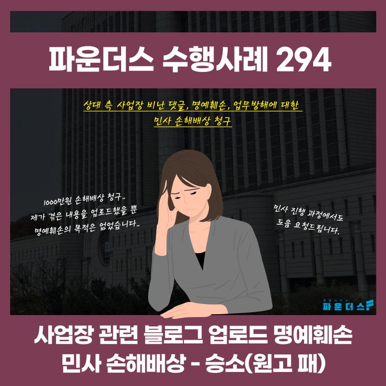 ![[민사 손해배상 승소] 사업장 비난 댓글 작성 명예훼손 민사소송](/_next/image?url=https%3A%2F%2Fd2ai3ajp99ywjy.cloudfront.net%2Fuploads%2Ftitleimage%2Foriginal%2F5b7519494b39577da0a5626e-original.jpg&w=3840&q=75)