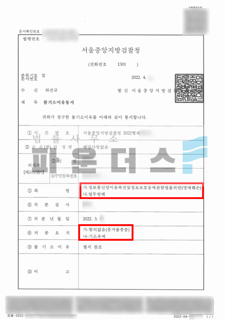 사건의 쟁점) 앞서 변호인은 의뢰인의 형사사건 진행에 있어 적극적인 조력을 드렸고 그 결과 명예훼손 – 혐의없음 / 업무방해 – 기소유예 처분으로 마무리 지을 수 있었습니다.