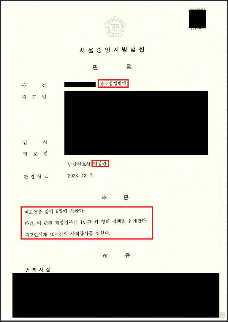 그 결과 법원은 의뢰인의 공무집행방해 혐의에 대해서 집행유예 판결을 선고하여 주셨습니다.
