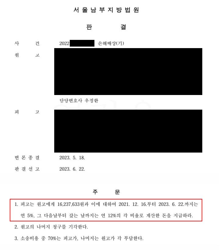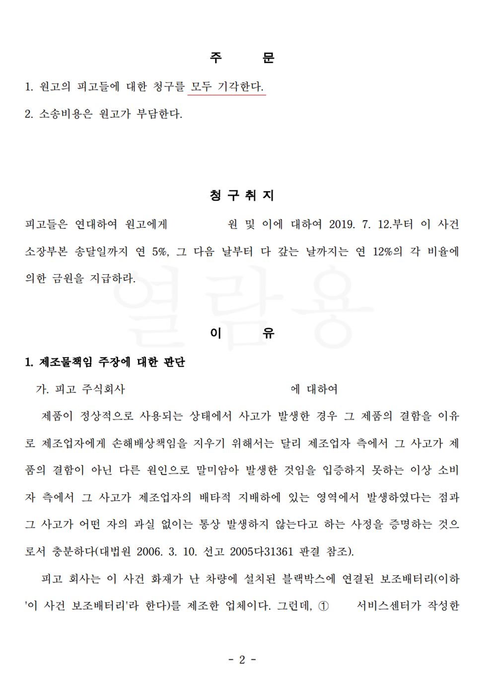 승소 판결: 재판부는 이러한 증거들을 바탕으로 설치업체의 불법행위를 인정하였고, 차주는 차량 전소에 대한 손해를 배상받을 수 있었습니다.