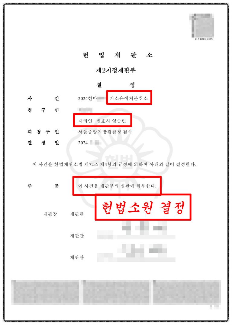 임승빈 변호사는 의뢰인을 위하여 헌법재판소에 검사의 기소유예처분의 취소를 구하는 헌법소원심판을 청구하였습니다. 헌법재판소는 기소유예처분취소 사건을 재판부의 심판에 회부하는 결정을 하였습니다. 임승빈 변호사는 헌법재판소에 의뢰인의 억울함을 법리적으로 설명하였고, 이러한 헌법소원심판을 통해서 의뢰인은 최종적으로 무혐의 처분을 받을 수 있었습니다.