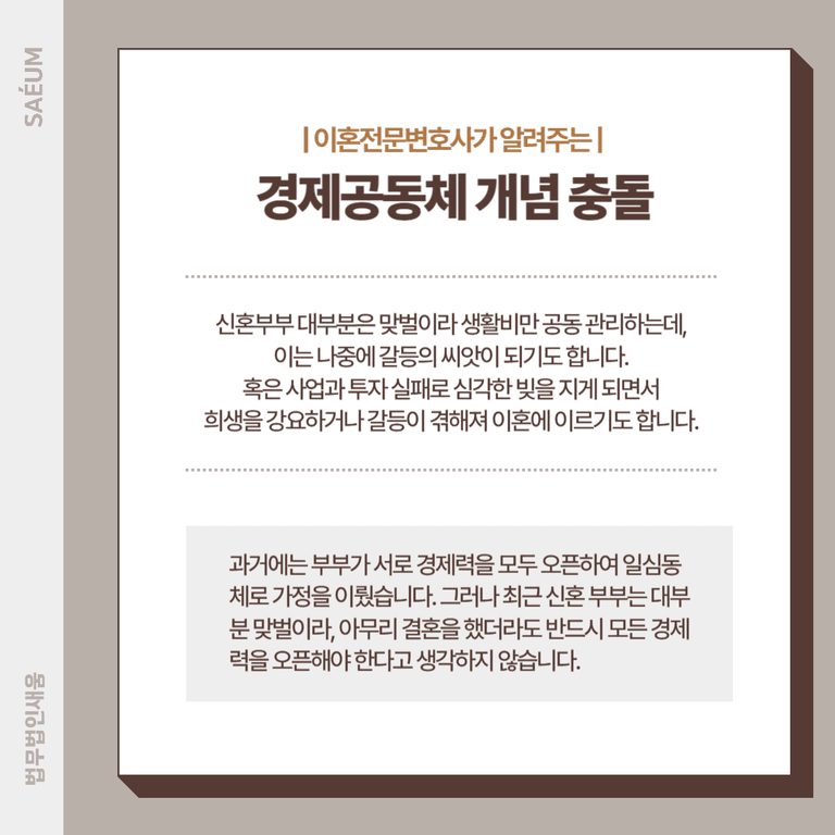 그에 따라 각자 벌어들인 수입 내에서 부담해야 하는 생활비만 공동으로 관리하는 경우가 흔합니다. 문제는 처음에는 괜찮았던 개별 관리가 나중에 갈등의 씨앗이 되는 일이 많다는 점입니다. 각자 생활비를 부담하여 가정을 꾸려 나가다 보면, 일방이 더 많은 비율을 사용하는 것은 아닌지 의심하고 싸우는 경우가 잦아지게 됩니다.