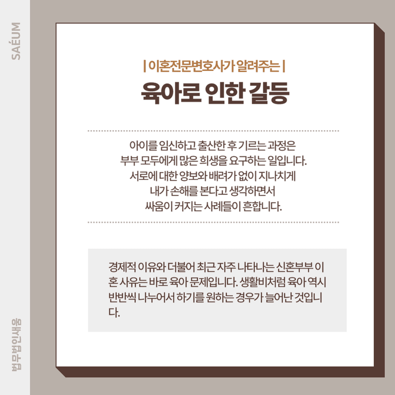 경제적 이유와 더불어 최근 자주 나타나는 신혼부부 이혼 사유는 바로 육아 문제입니다. 아이를 임신하고 출산한 후 기르는 과정은 부부 모두에게 많은 희생을 요구하는 일인데요. 현실적으로 생활비처럼 육아를 반반씩 나누어서 하기를 원하는 경우가 늘어난 것입니다.