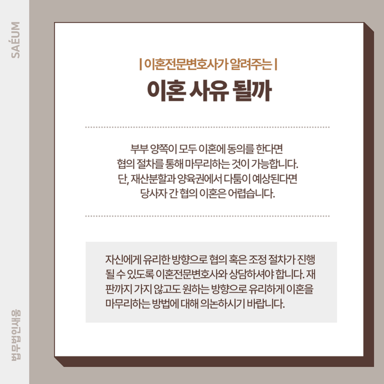 만일 일방에게 혼인을 지속할 수 없는 중대한 책임을 물어야 하거나, 재산분할에 있어 의견이 맞지 않거나, 양육권으로 다툼이 생길 우려가 있다면 당사자 간에 해결이 되기가 어렵습니다.