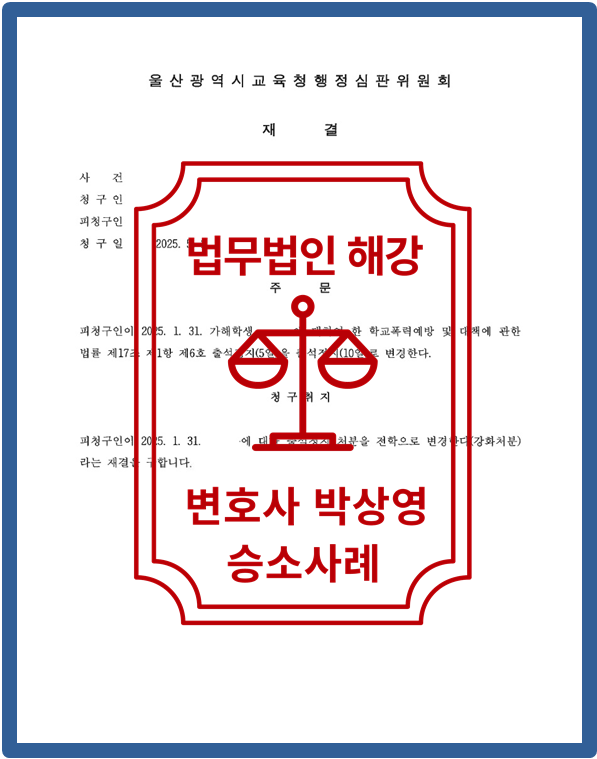 상대방은 화장실에서 용변을 보고 있는 의뢰인을 휴대폰 카메라로 촬영을 하여 의뢰인에게 상당한 정신적 고통을 주었습니다. 의뢰인은 상대방의 이러한 행동에 대응하고자 저희 법무법인 해강을 찾아주셨습니다. 저희 법무법인 해강에서는 가해학생 처분 조치 결정을 이끌어냈으나 결정이 부당하다 생각한 의뢰인은 한번 더 저희 법무법인 해강을 찾아주셨습니다.