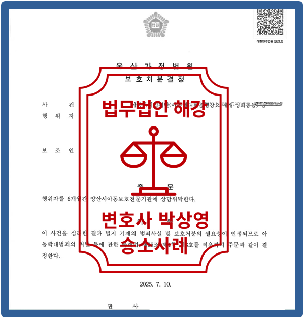 저희 법무법인 해강은 법리적인 검토를 통하여 의뢰인 상황에 맞춘 변호인 의견서 등 작성을 통하여 의뢰인을 위해 최선을 다하였고 이에 [보호처분]을 이끌어냈습니다.