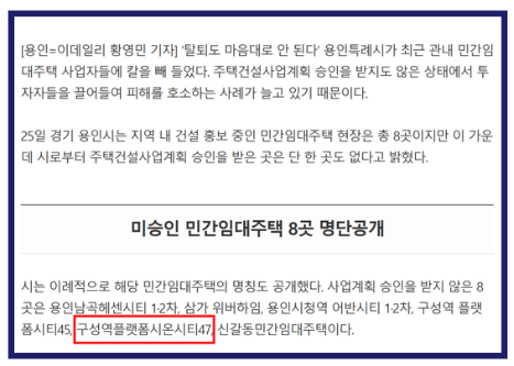 이러한 흐름 속에서, 경기도 용인시 언남동 일대에서는 ‘구성역 플랫폼시온시티47’이라는 이름의 민간임대아파트 사업이 추진 중이며, 해당 사업을 진행하는 시온주택정비주민협의회는 ‘3천만 원대 내 집 마련’, ‘확정 분양가’ 등의 문구를 앞세워 최근까지도 활발히 회원 모집을 이어가고 있어, 각별한 주의가 요구되는 상황입니다.