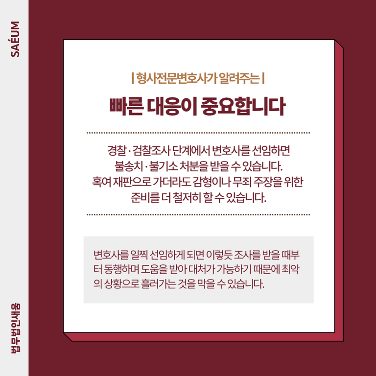또한 일찌감치 대응을 한 경우 시간을 충분히 확보할 수 있게 됨에 따라 더 탄탄히 재판을 대비하는 것이 가능합니다. 변호사를 일찍 선임하게 되면 이렇듯 조사를 받을 때부터 동행하며 도움을 받아 대처가 가능하기 때문에 최악의 상황으로 흘러가는 것을 막을 수 있습니다. 무엇보다 함께 조사를 받게끔 동행하여 문제가 되는 언행을 하지 않게끔 대처가 가능하기 때문에 이후 선처를 받을 가능성을 더 높여볼 수가 있습니다.