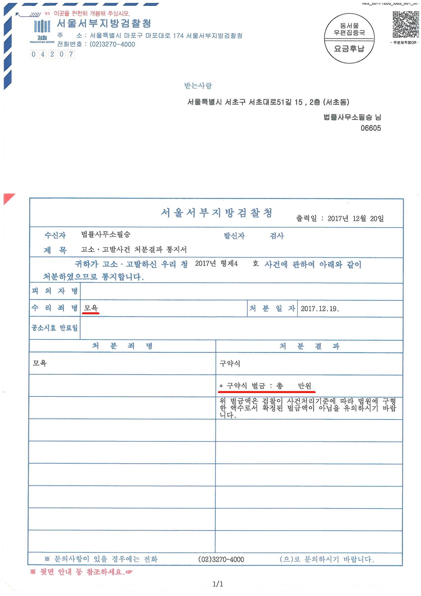 특정성 성립과 모욕죄 성립요건에 대한 꼼꼼하고 법리적인 주장이 받아들여져, 피의자의 모욕죄가 인정되어 검찰은 피의자를 기소처분하였고, 법원 역시 피의자에게 벌금형을 선고하였습니다.