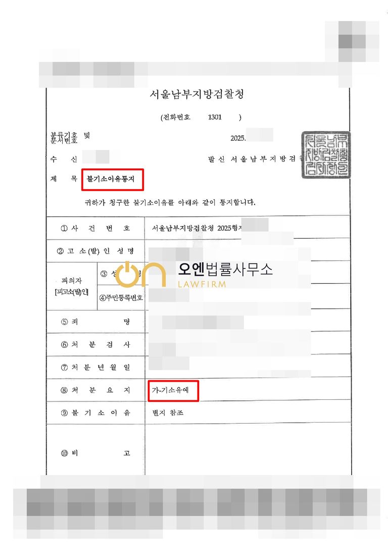 검찰은 오엔법률사무소의 주장을 받아들여, 의뢰인이 처벌 기준치인 0.03%를 근소하게 초과하는 점, 자신의 행위를 인정하고 재범방지교육 수료하였다는 점 등의 정상을 참작하여 도로교통법위반(음주운전) 혐의에 대해서 기소유예결정(불기소결정)을 내렸습니다. 의뢰인은 경찰 조사 당시 면허정지 처분을 받았으나 이에 따라 다시 운전면허를 유지할 수 있게되었습니다.