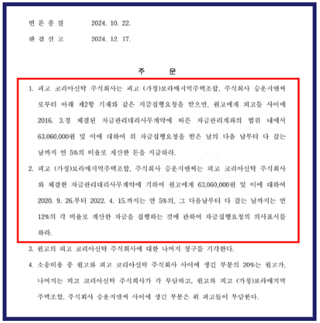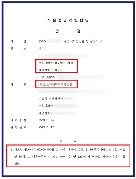 이에 대해 최동욱 변호사는 조합의 위법성과 기망적 계약 유도 정황을 근거로 법원에 적극적으로 주장하였고, 서울중앙지방법원은 이러한 주장을 받아들여 조합 측이 의뢰인에게 6,300만 원 전액과 함께 이에 따른 지연이자를 지급하라는 판결을 내렸습니다.