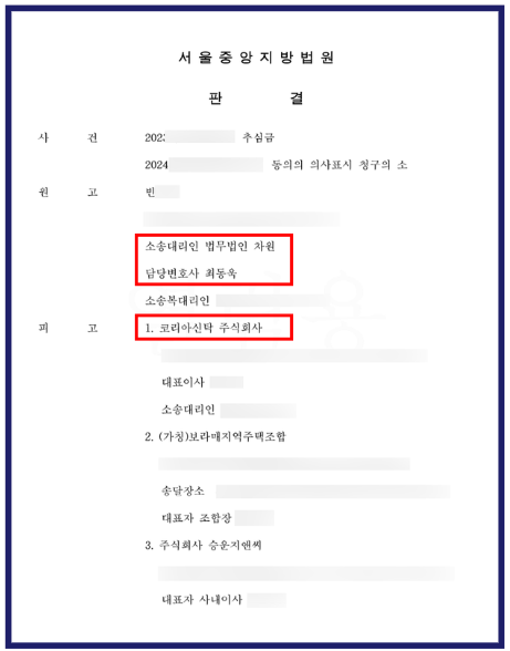 이번 사례는 조합의 자금을 관리하는 신탁사가 법원의 환불 판결에도 불구하고 납입금 지급을 거부하자, 최동욱 변호사가 코리아신탁을 상대로 직접 추심금 청구 소송을 제기해 승소하고, 결국 의뢰인에게 실질적인 금액을 돌려드린 사건입니다. 이처럼 단순히 법정 판결을 이끌어내는 것을 넘어, 실제 금전적 피해까지 회복한 사례는 매우 중요한 의미를 지닙니다. 조합과의 분쟁으로 금전적 손해를 입으셨다면, 본 사례를 참고해 실질적인 회복 방안을 적극적으로 모색해보시길 권해드립니다.