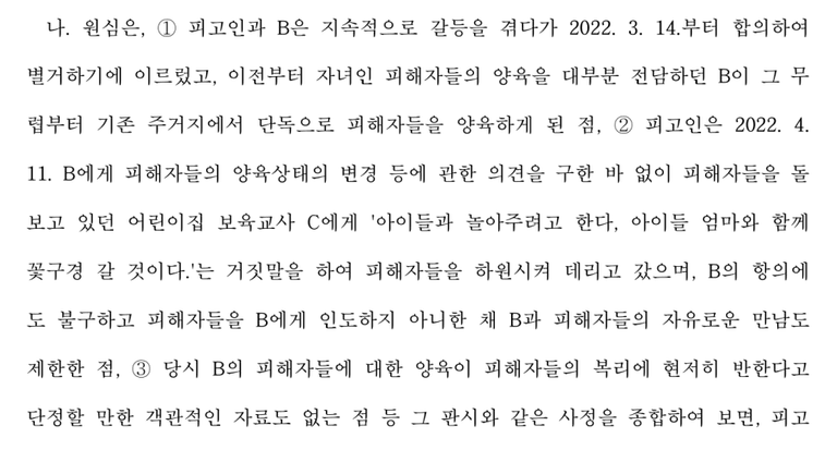이 사건의 피고인은 아이의 친부로, 아내 B씨와 별거 중이었습니다. 평소 아이의 양육은 주로 B씨가 담당하고 있었습니다. 피고인은 어느 날 유치원에 찾아가 보육교사에게는 "아이들 엄마와 꽃구경 갈 것이다"고 말하며 아이를 하원시켰습니다. 그러나 피고인은 약속과 달리 아이를 데리고 돌아오지 않았습니다. B씨가 아이의 반환을 요구했지만 피고인은 이에 응하지 않았고, 이후 B씨가 아이를 만나려는 시도마저 제한했습니다.