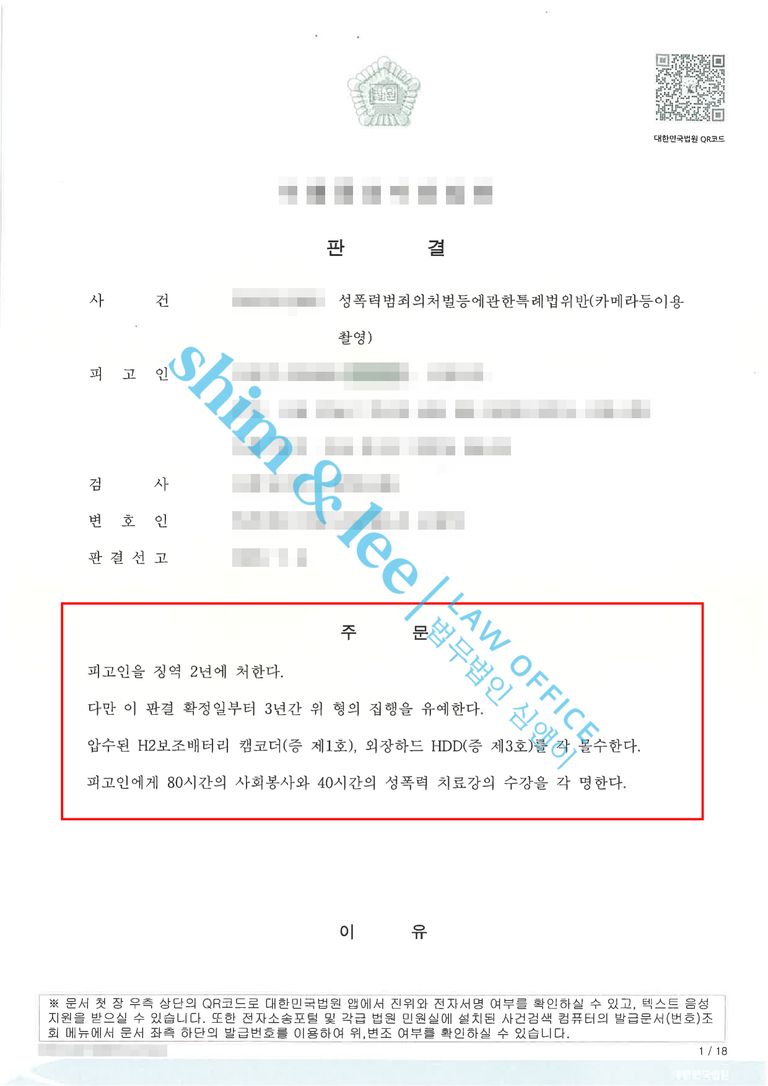 - 이후 재판부는 ‘촬영물의 수위가 매우 높고, 범행 횟수가 적지 않으며, 은밀한 촬영을 위해 별도의 장비까지 준비하는 등 계획적인 정황이 명백하다’고 판단하였고, 합의를 했음에도 불구하고 가해자에게 징역 2년, 집행유예 3년, 사회봉사 80시간, 성폭력 치료강의 40시간을 선고하였습니다.