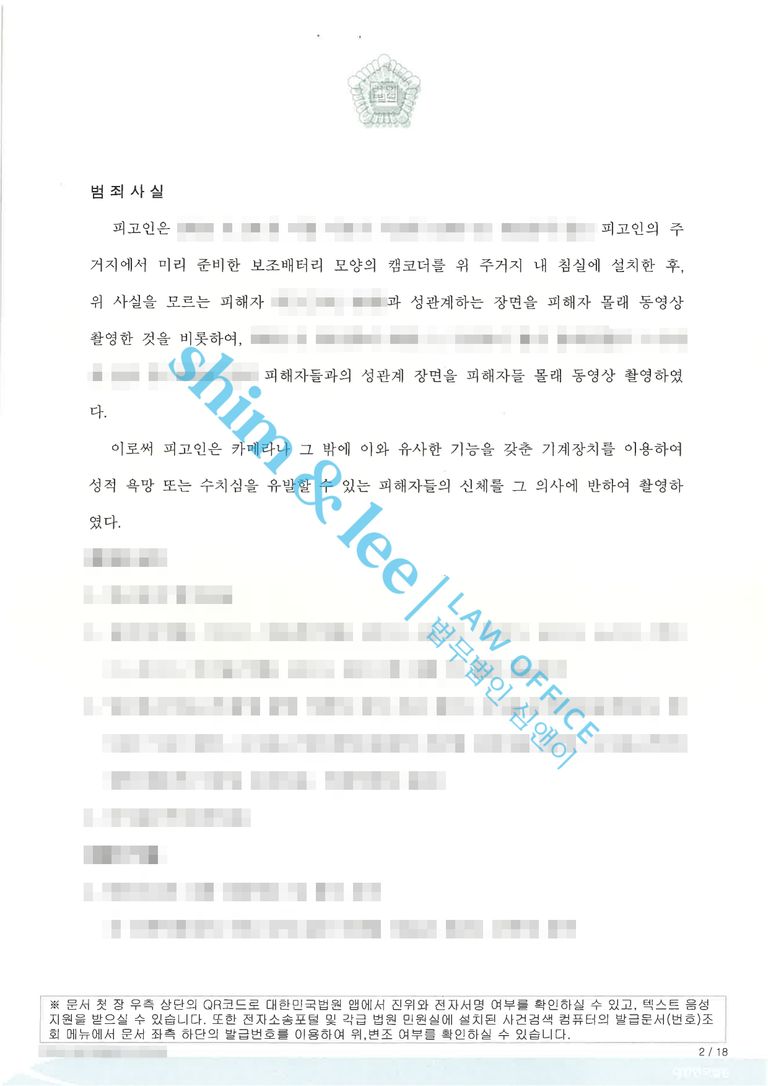 - 이후 수사 결과 가해자의 카메라등이용촬영 혐의가 인정되어 불구속 구공판 처분이 내려졌고, 사건은 재판 단계로 넘어가게 되었습니다. 의뢰인은 재판 단계를 앞두고 보다 체계적이고 전문적인 지원이 필요하다고 판단하여, 심앤이에 도움을 요청하셨습니다.