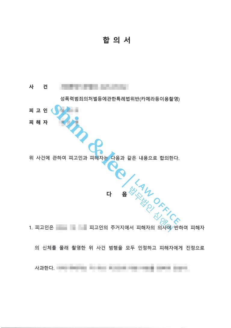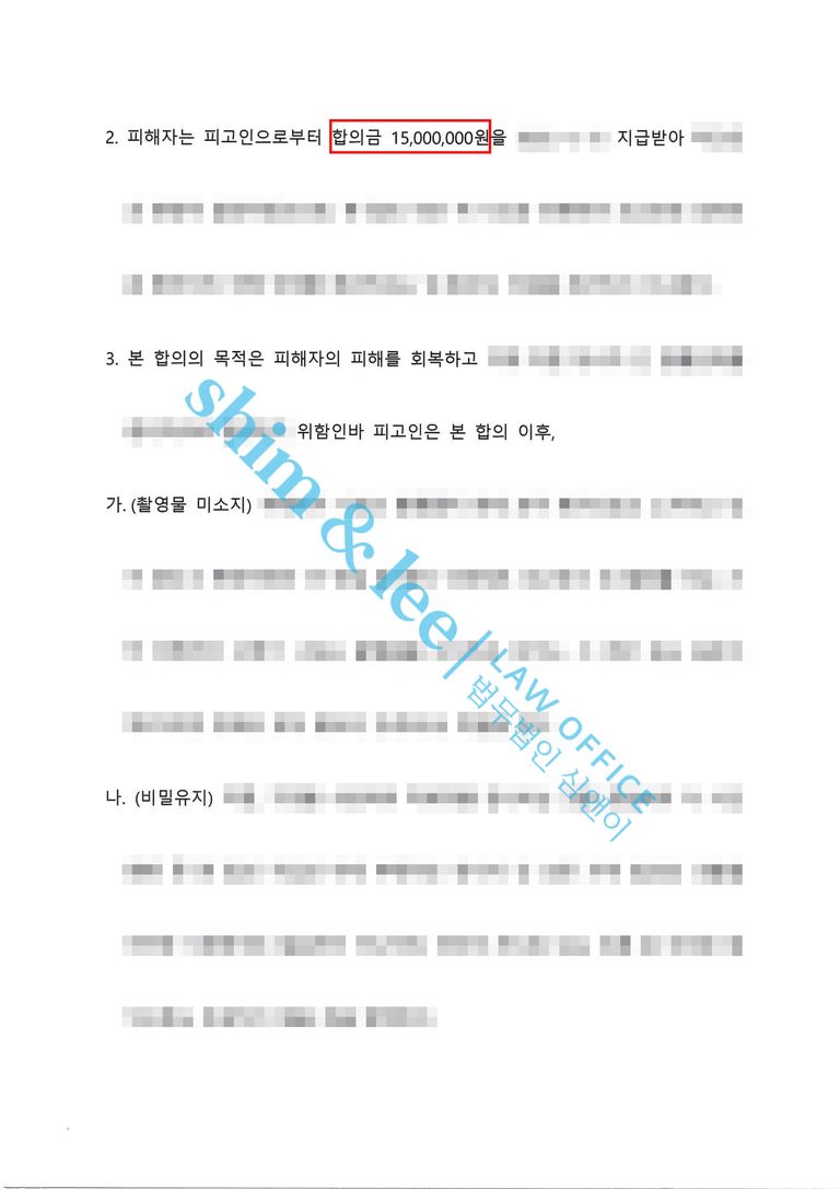 - 대표 변호사님의 단호한 대응과 전략적인 협상 끝에, 가해자는 초기 제안 금액보다 크게 상향된 1,500만 원을 최종 합의금으로 수용하였고, 이와 함께 촬영물 미소지, 비밀유지, 접근금지 및 통신제한, 소제기 금지 등 2차 피해를 방지하기 위한 조항들을 포함하여 의뢰인에게 유리한 조건으로 합의를 마무리하였습니다.