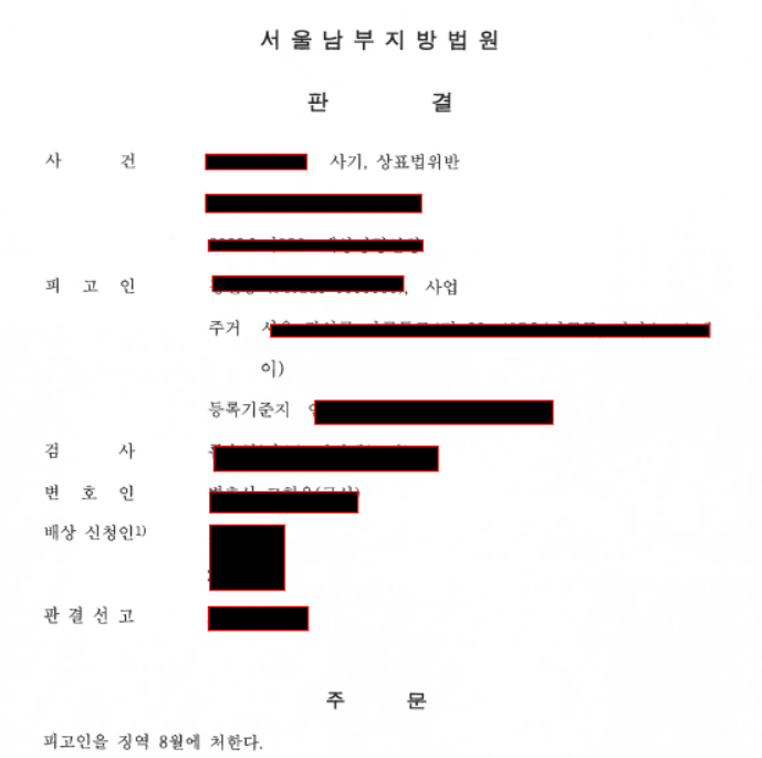 검찰은 피고소인을 사기 및 상표법위반으로 기소하였고, 법원은 공소사실을 모두 인정하면서 피고소인에 대하여 실형을 선고하여 피고소인이 법정구속되었습니다.
