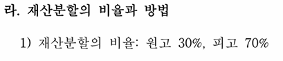 그 결과 남편과 아내의 재산분할비율이 70%:30%로 인정되었으며, 원고가 재산분할로 청구한 금액의 1/3로 방어하였습니다.