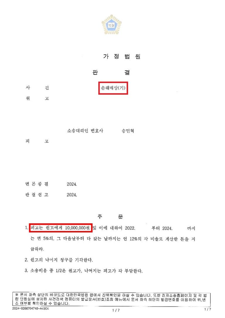 위자료 승소 판결 받은 사안에 대해 소개해 드리고 자 합니다.