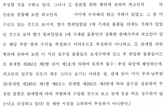 검사는 관세법, 상표법 위반으로 인하여 필요적 추징을 구하였지만 밀수입 물품들이 모두 보세구역을 통해 들어오게 된 점을 통해 해당 물품은 필요적 몰수, 추징 대상이 아닌 임의적 추징대상이라는 점을 강하게 주장했고, 피고인이 관세를 이미 납부한 점을 들어 이중추징의 위험이 있다는 점을 말씀드렸습니다. 재판부에서는 이러한 사실관계를 인정하여 피고인에게 벌금 1,000만 원을 선고하면서 추징을 면제해주었습니다.