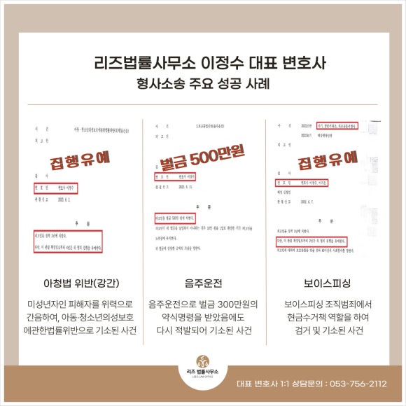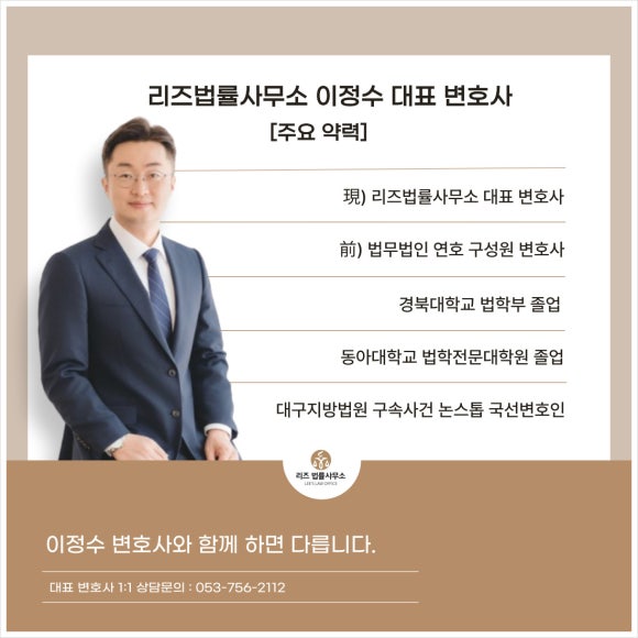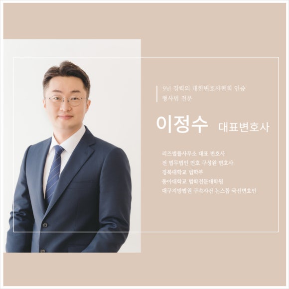안녕하세요. 9년 경력의 대구·경북 지역 형사 전문 변호사, 리즈법률사무소 이정수 대표변호사입니다.