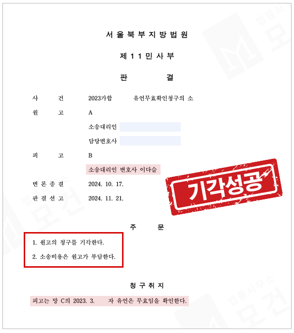 이때 무효확인청구소송을 진행하여 법원의 판결로 유언장효력을 다툴 수 있는데요. 이다슬 변호사의 성공사례 중 '피고'의 입장에서 소송을 방어한 사례가 있어 소개해드립니다.