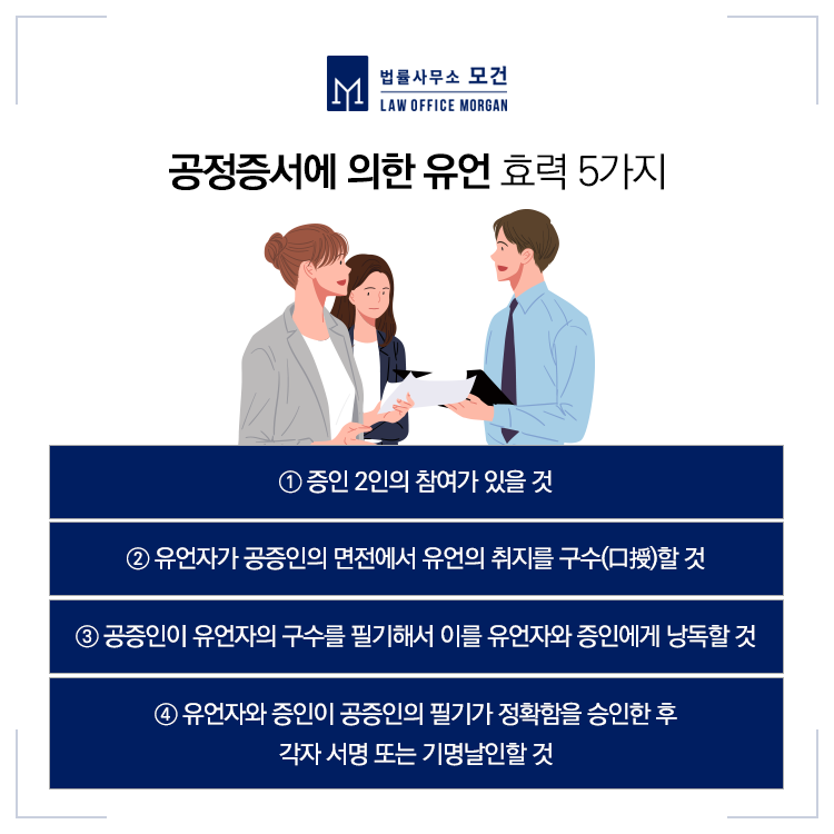 민법에 따르면 유언은 법에서 정한 방식에 의하지 않으면 효력이 발생하지 않습니다. 의뢰인의 사례처럼 유언공증은 아래와 같은 요건을 필요로 합니다.