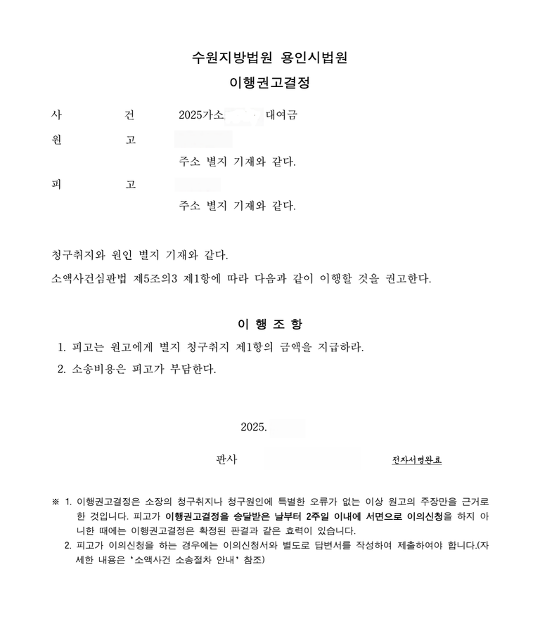 저는 즉각 대여금청구소송을 제기하여 기타 증거로 대여사실을 주장 입증하였고 법원은 이행권고결정을 내려 확정되어 의뢰인은 대여금을 변제받았습니다.