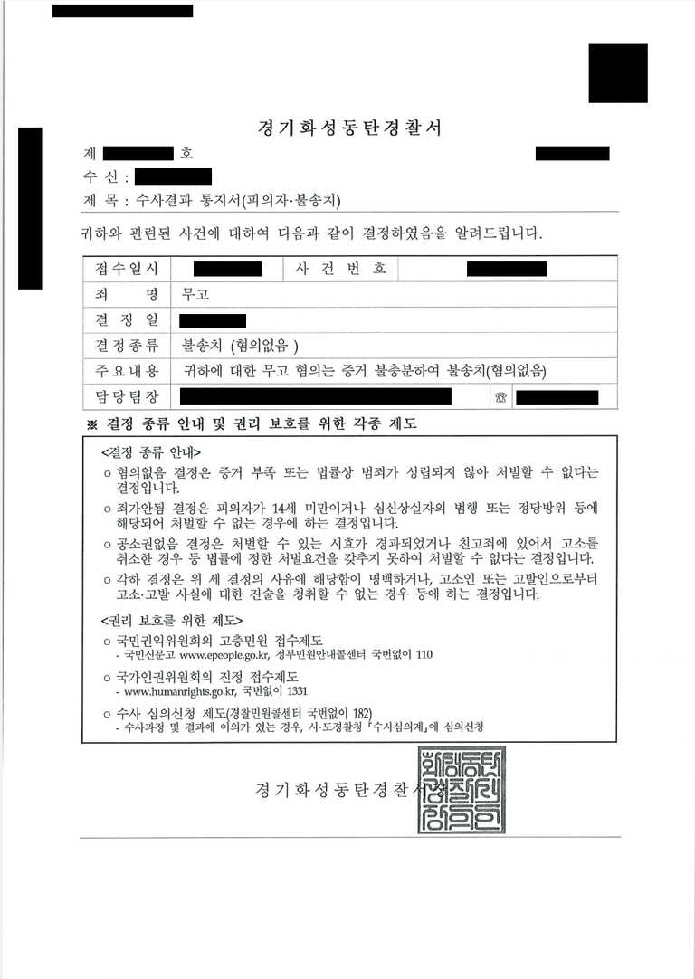 이러한 변호내용을 받아주셔서 사법경찰관은 의뢰인의 무고 혐의에 대해 불송치(혐의없음) 결정을 내려주셨습니다.