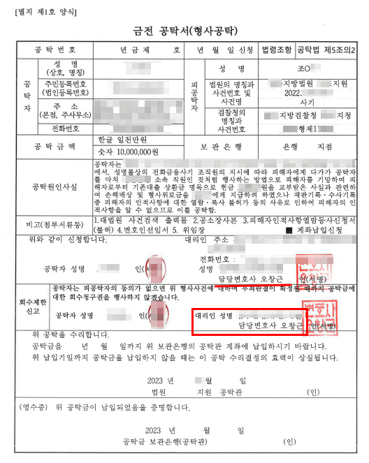 형사공탁, 특히 형사특례공탁이란 12대중과실로 인한 교통사고, 사기(보이스피싱)와 같은 재산범죄, 성추행, 강간 등의 성범죄 사건, 폭행사건 등에서 피해자 피고인이 피해회복을 위해 일정 금액을 공탁하는 제도로 이로 인해 피해자의 피해회복을 도울뿐만 아니라, 가해자인 피고인 또한 반성하고 있으며, 피해회복을 위해 노력하고 있다는 점을 법원에서 고려하여 양형에 반영할 수 있도록 하기 위해 만든 제도 입니다.