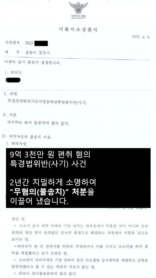 리모델링 공사에 관하여 9억 3천만 원 상당의 대금을 편취하였다는 내용으로 조사가 진행되었고, 2년이 넘는 시간 동안 5차례에 걸친 고강도 조사에 면밀히 대응하고 수십 장의 변호인의견서를 제출함으로써 피의자 3명 전원에 대한 "무혐의(불송치)" 처분을 이끌어 냈습니다.