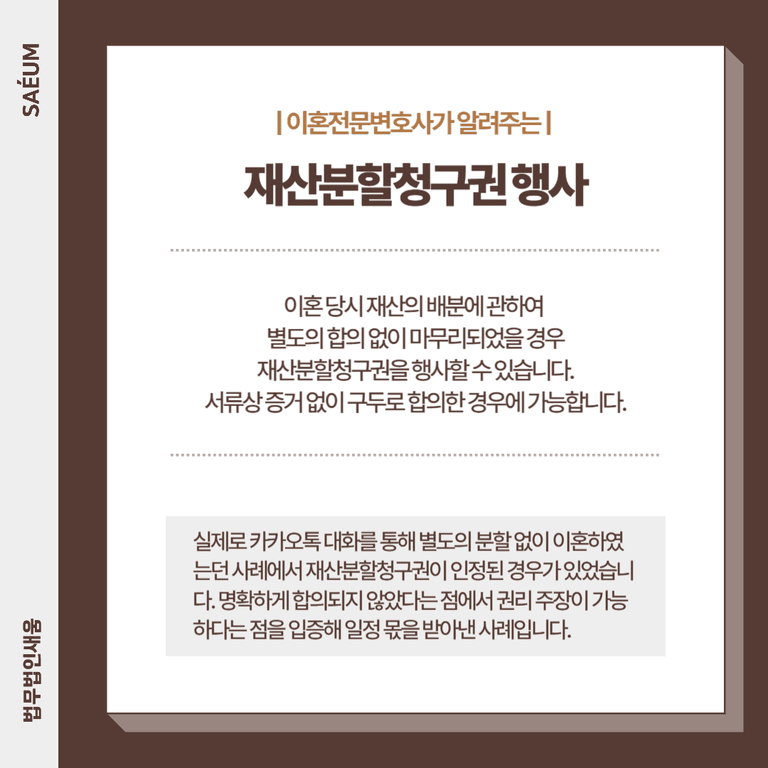 실제로 제가 담당하였던 사례 중에서, 의뢰인께서 카카오톡 대화를 통해 별도의 분할 없이 이혼하였는데 나중에 재산을 청구할 수 있는지 문의하신 경우가 있었습니다. 명확하게 합의가 되지 않았다는 점에서 권리를 주장할 수 있음을 입증하여 일정 몫을 받으셨습니다.