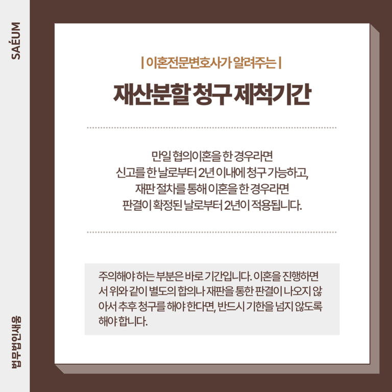다만 이때 주의해야 하는 부분은 바로 기간입니다. 이혼을 진행하면서 위와 같이 별도의 합의나 재판을 통한 판결이 나오지 않아서 추후 청구를 해야 한다면, 반드시 기한을 넘지 않도록 해야 합니다.