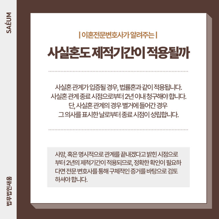 또한 제척기간 역시 적용됩니다. 사실혼 관계가 종료된 시점으로부터 2년 이내에 청구해야 합니다. 이때 정확한 종료 시점의 확인이 중요한데요.
