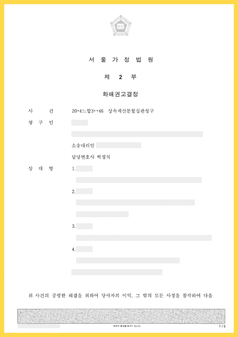 이상을 바탕으로 화해권고결정을 통하여 청구인들과 상대방들 사이에 이 사건 각 부동산을 일정 비율로 소유하는 것으로 화해를 권고하였고, 청구인과 상대방들이 모두 이의하지 않아 화해가 성립되었습니다.