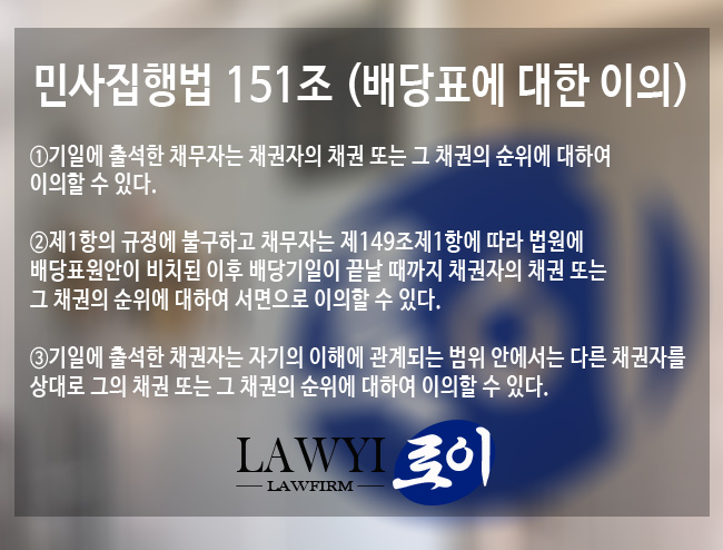 첫째. 채권자는 배당기일에 출석하여 채권 배당순위와 배당표의 작성 확정 및 실시에 고나하여 이의를 진술합니다. (민사집행법 제151조.)