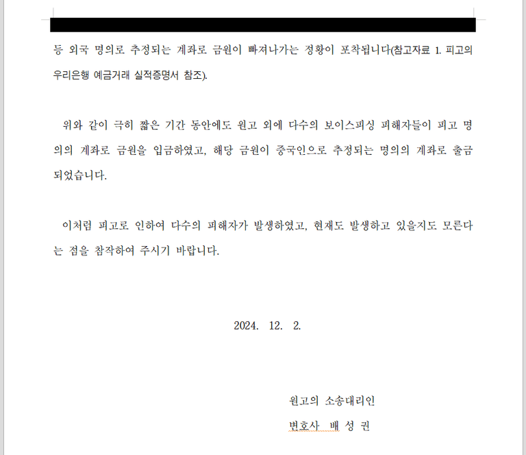특히 2)항의 경우 법원은 최근 보이스피싱 통장대여자의 고의, 과실 정도에 따라 그 책임을 제한하고 있으므로 손해배상액을 전액 인정받는 데에는 많은 노력이 필요하였습니다. 재판과정에서 밝혀진 바에 의하면, 통장대여자의 통장에 다수의 피해자들로부터 거액의 보이스피싱 피해금액이 입금된 정황이 발견되었고, 저는 이를 바탕으로 통장대여자의 범죄 가담 정도가 높다고 주장하였습니다.
