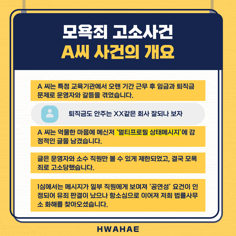 A 씨는 오랜 기간 특정 교육기관에서 성실히 근무해 왔으나, 퇴직을 앞둔 시점에 임금 및 퇴직금, 추가근무수당 미지급 문제로 운영자 측과 갈등을 겪게 되었습니다. 답답한 마음에 A 씨는 자신이 겪은 부당함과 억울함을 표현하기 위해 메신저 앱의 "멀티프로필 상태메시지" 기능을 이용해 감정적인 글을 게시했습니다.