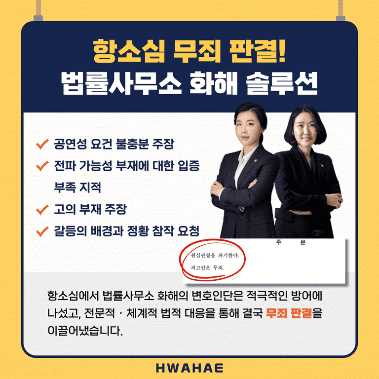 항소심에서 A 씨는 법률사무소 화해의 변호인단에 의뢰하여 적극적인 방어에 나섰고, 아래와 같은 전문적 · 체계적 논리를 통해 결국 무죄 판결을 이끌어냈습니다.