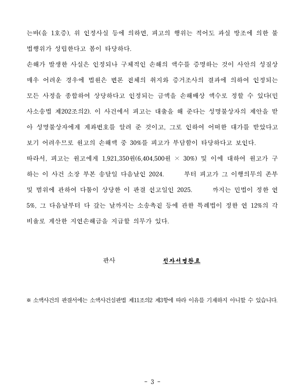 저는 즉각 입금 받은 자를 피고로 하여 민사소송으로 주위적으로 부당이득반환청구, 예비적으로 과실방조에 기한 불법행위 손해배상청구를 하였고 법원은 손해배상책임을 인정하여 의뢰인은 피해액을 반환받았습니다.
