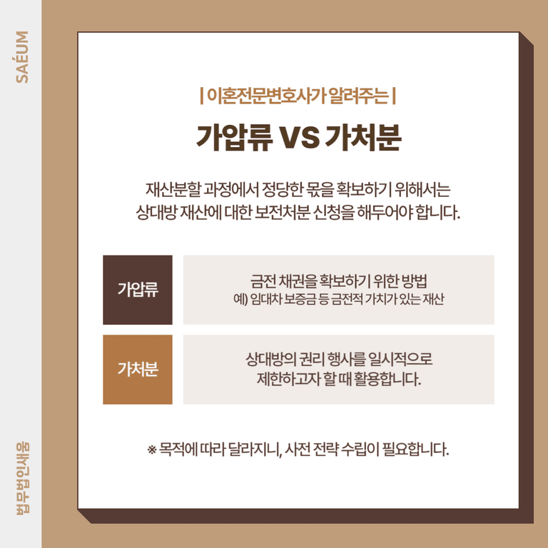 이혼 과정에서는 감정적 대응보다 체계적인 재산 보호 전략이 우선되어야 합니다. 특히 명의가 배우자에게만 있는 재산의 경우, 사전에 신속한 보전처분을 통해 실질적인 권리 보호를 도모할 수 있습니다. 가압류 절차는 그 자체로 복잡하고 까다로운 법률 절차이므로, 가능한 한 이혼 전 전문 변호사의 조력을 받아 대응 전략을 세우는 것이 안정적인 재산분할을 위한 첫걸음입니다.