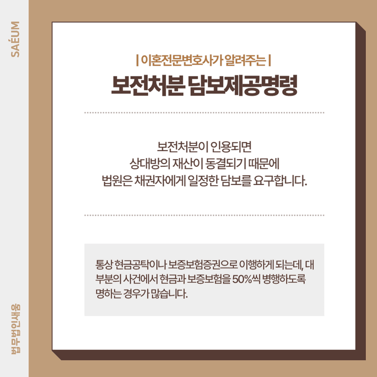 또한 보전처분을 통해 상대방의 재산을 동결시키는 만큼, 법원은 채권자에게 일정한 담보를 요구합니다. 이 담보는 통상 현금공탁이나 보증보험증권으로 이행하게 되는데, 대부분의 사건에서 현금과 보증보험을 50%씩 병행하도록 명하는 경우가 많습니다. 그러나 현금 공탁의 경우 당장 큰 자금 부담이 발생하기 때문에, 이를 줄이기 위해 전액 보증보험 방식으로 대체하는 것이 현실적으로 유리합니다.