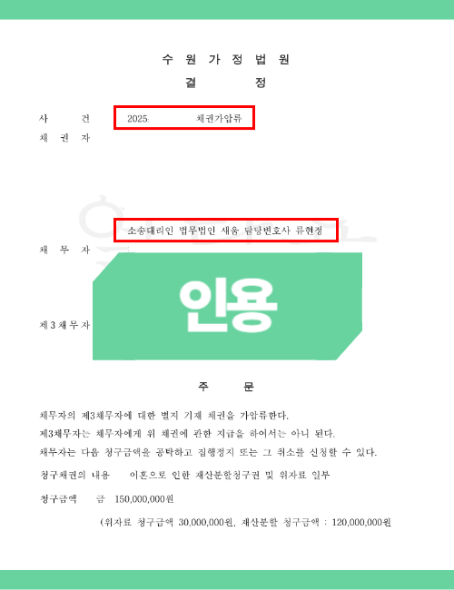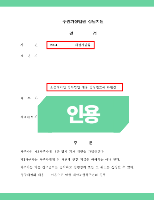 이에 따라 본 법무법인은 A씨가 현금공탁을 감당하기 어려운 사정—현재의 경제적 어려움, 이혼 소송 진행으로 인한 수입 단절 등—을 구체적으로 소명하며, 전액 보증보험 방식의 가압류 인용을 법원에 적극적으로 설득하였습니다. 그 결과, 높은 금액의 청구임에도 불구하고 전액 보증보험으로 가압류가 인용되어 A씨는 큰 경제적 부담 없이 필요한 보전처분을 성공적으로 진행할 수 있었습니다.