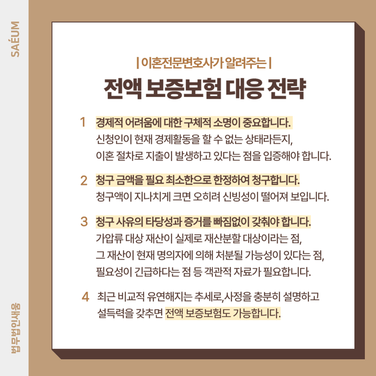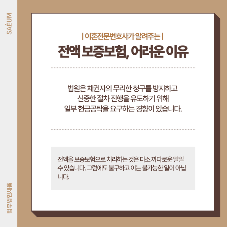 마지막으로, 최근 법원의 보전처분 관련 실무는 비교적 유연해지는 추세이기 때문에, 사정을 충분히 설명하고 설득력을 확보한다면 전액 보증보험 처리도 충분히 가능합니다.