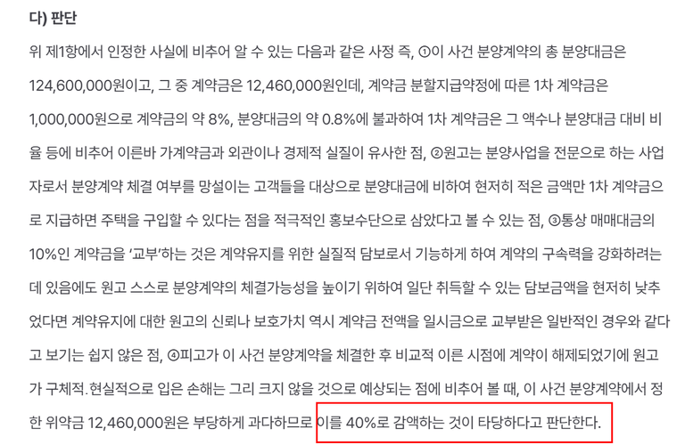 저는 의뢰인에게 분양대행사가 요구하는 위약금(총 공급대금의 10%)을 그대로 지급하지 말고 협상을 해서 금액을 다운할 것을 권고합니다. 위약금은 민법상 손해배상액의 예정에 해당하는데, 여러 가지 제반 사정을 고려하여 위약금이 부당히 과다하다고 판단되면 법원은 직권 감액을 할 수 있습니다.