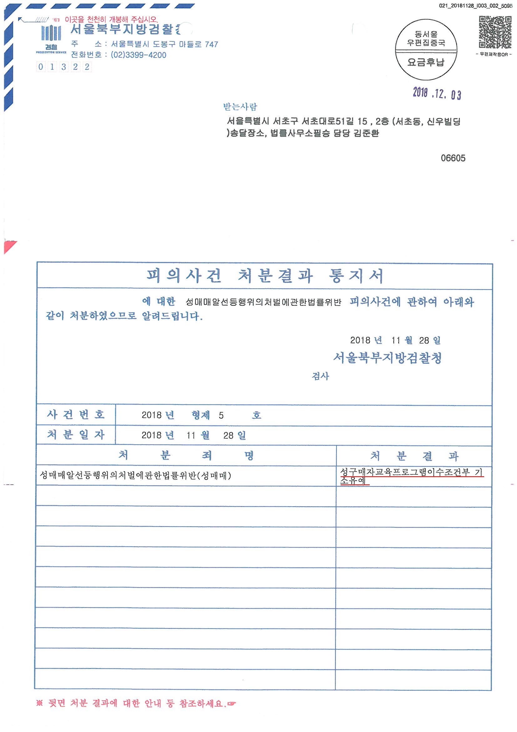 제가 안내해드린 다양한 양형자료를 적극적으로 제출하고 선처를 호소하는 변호인의견서를 통해 서울북부지방검찰청은 의뢰인님에게 "교육조건부 기소유예"처분을 내렸습니다.